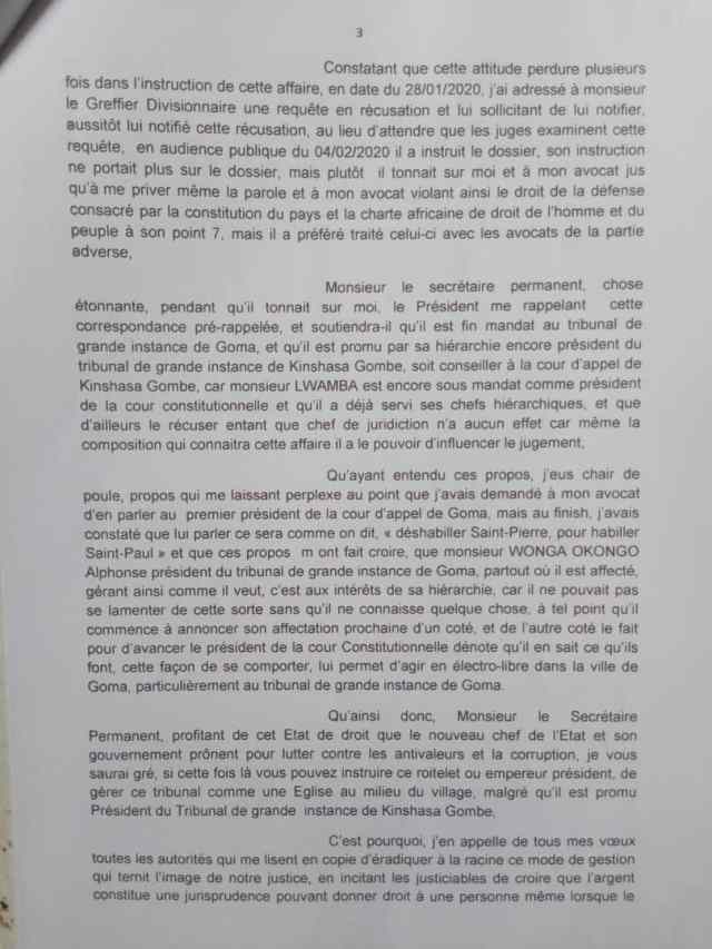 Mademe Kanyere rappelle au Secrétaire permanent qu’en date du 27/10/2017 par sa lettre sans numéro, lui adressée dont l’accusé de réception était du 10/11/2017, sous le numéro d’enregistrement 2716, dont copie a été réservée au président de la Cour Constitutionnelle sous 19320, au ministre de la justice sous 15116, au Premier Président de la Cour de Cassation sous 8386, cette citoyenne de Goma avait dénoncé le caractère corruptible de monsieur Wonga Okongo dans son dossier RC 18635 que ce dernier ne donne raison qu’à la personne qui donne de l’argent, ainsi pour lui, l’argent constitue une source de droit.